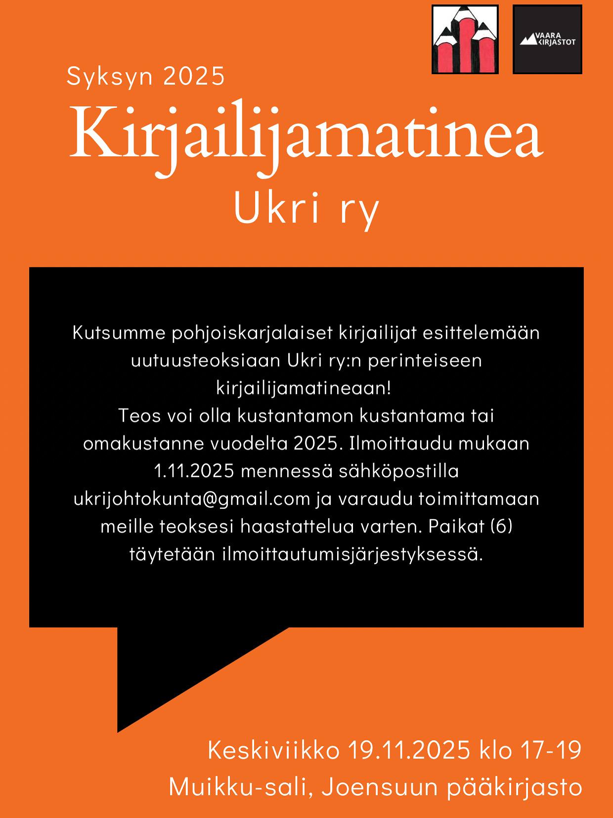 Kutsumme taas pohjoiskarjalaisia kirjailijoita esittelemään uutuuskirjojaan Ukrin perinteisessä matineassa! Vuoden 2025 ensimmäinen kirjailijamatinea järjestetään Joensuun pääkirjaston Muikku-salissa…